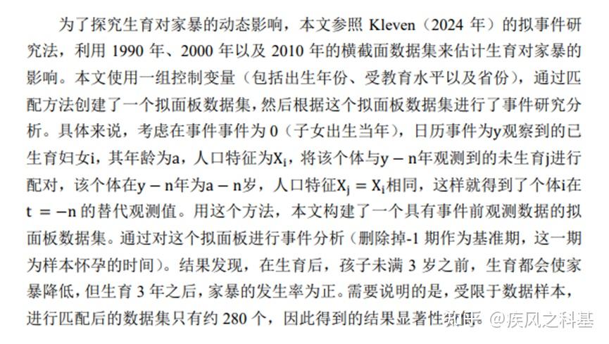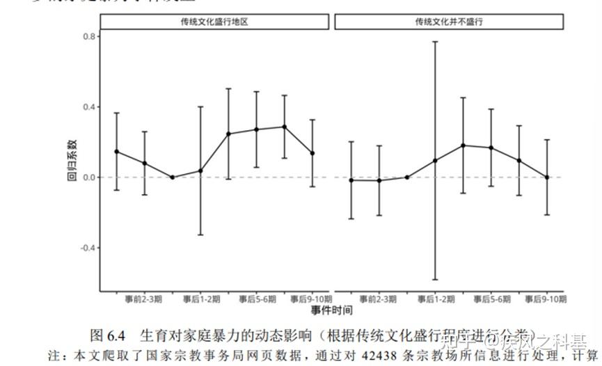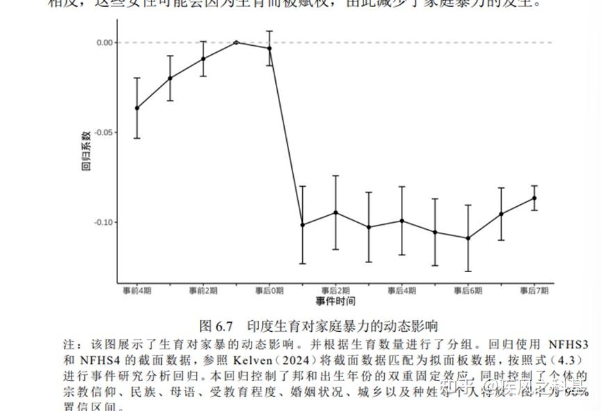杨女士第六章使用了一个很“奇怪”的拟自然实验(她称之为拟事件研究法)思路分析生育对家暴的“动态影响”。