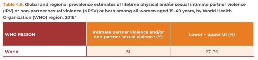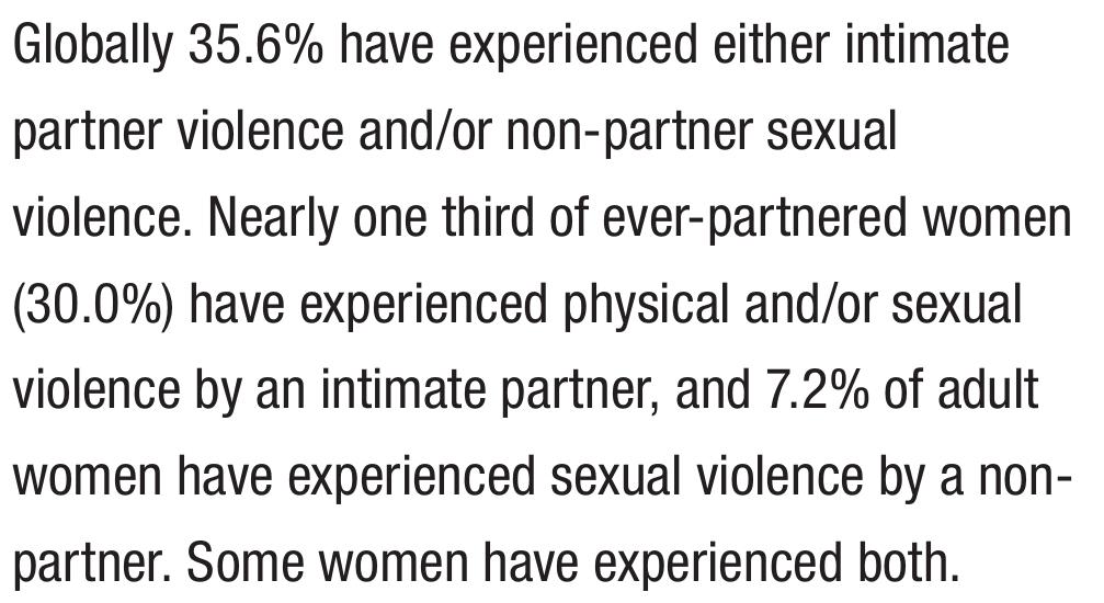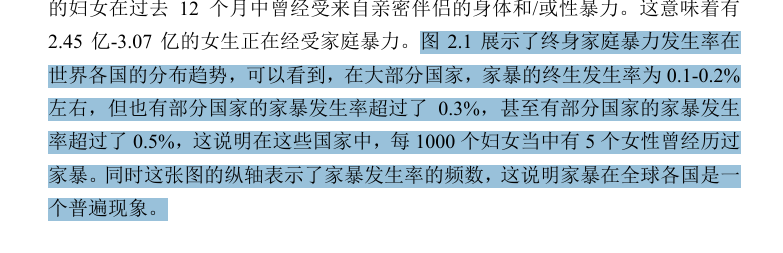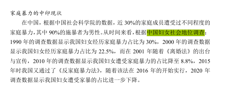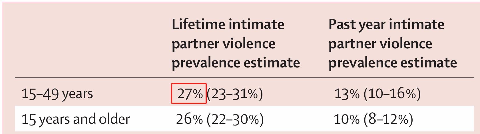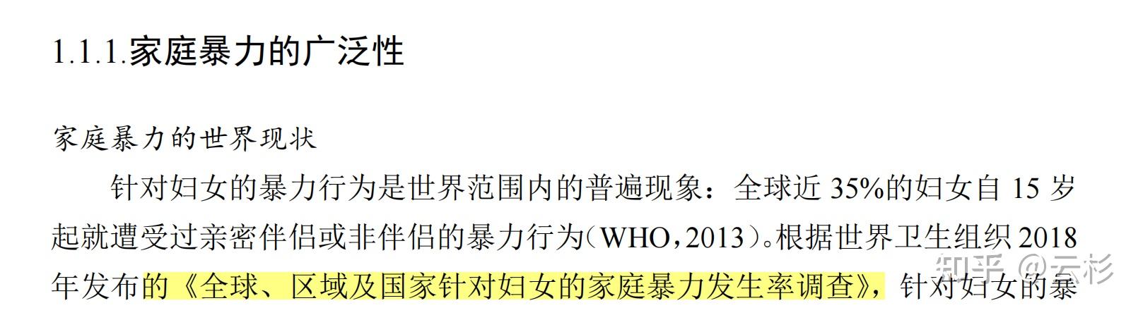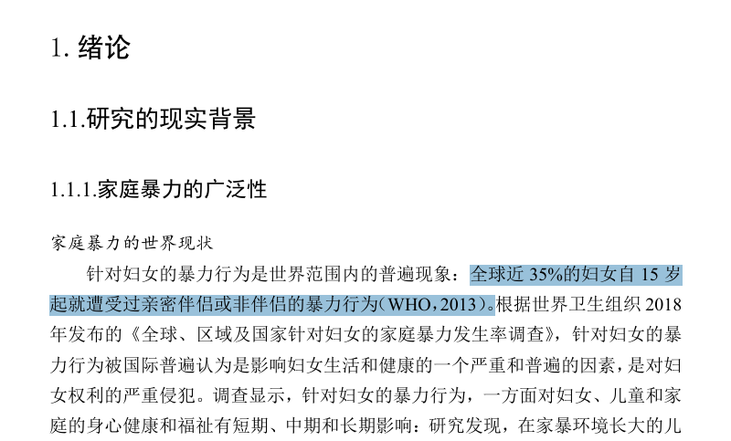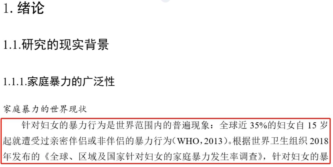 这篇报告全文提及数次,且做研究背景-家庭暴力的广泛性的开篇,未按国标标注引用,我也没找到原文。世卫组织2021年发了2018年的报告,报告名称与发布年份与文中对不上。