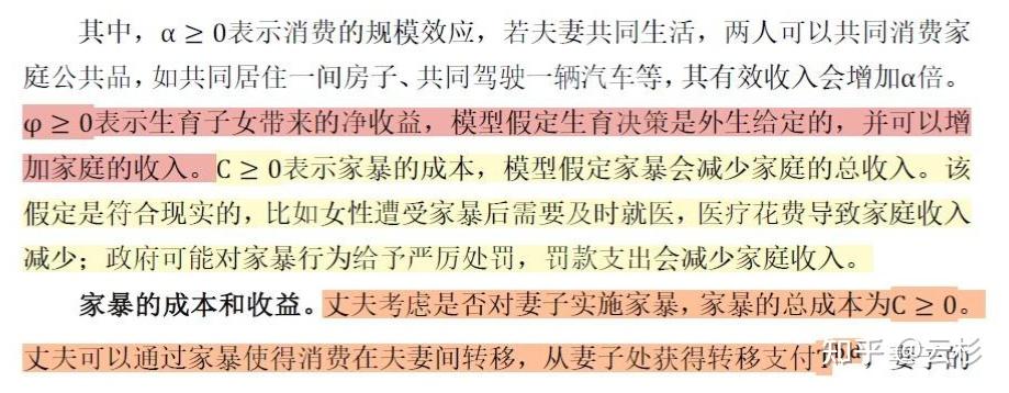 补充:第三章建了个模型,先假设生育会增加夫妻两的收入,然后说家暴之后妻子要看病,减少了收入,然后通过一个叫纳什谈判的公式,说增加的收入转移到男方了,所以家暴使男的收益增加。后面说男方因为家暴导致收益增加就一定会家暴,这其实是个假设,后面根本没有去证明,而是用她自己定义的公式去计算所谓的收益,每算一个收益,就说,收益增加了,所以生育导致家暴增加。首先生育会增加夫妻两的收入,这个前提假设就不符合实际,论证的过程有很大的问题。她认为“男方因为家暴导致收益增加就一定会实施家暴”,这个的说法开始只是她的假设,后面在没有论证,只对收益进行计算之后,这个假设便成为了结论的一部分。到后面每计算一组数据,显示男方因为家暴导致收益增加了,就会得出结论生育导致家暴增加。生育导致家暴增加不是统计出来的,而是计算男方收益算出来的: