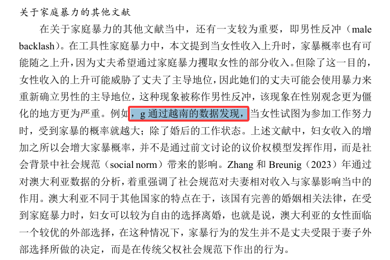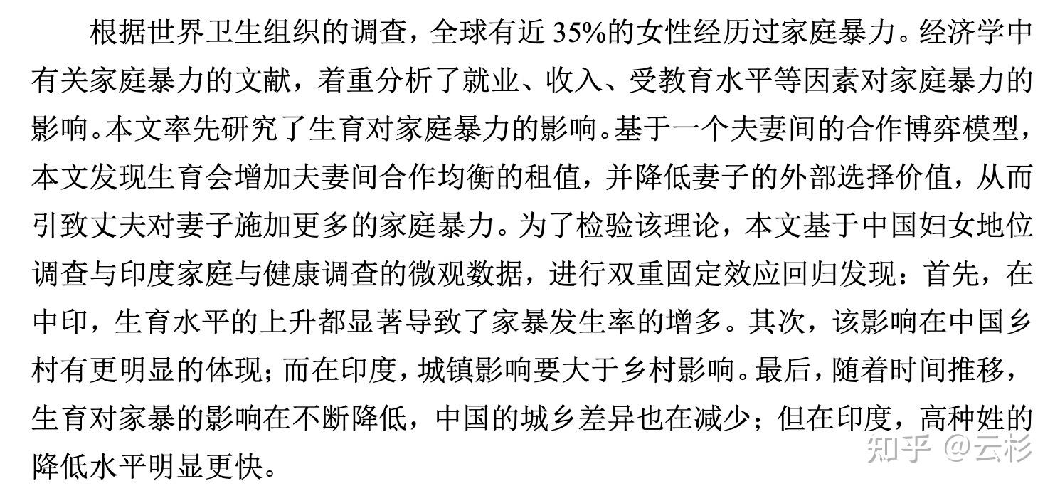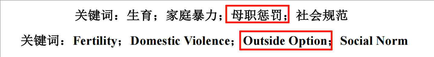 主题方面:本文论证对象即中印生育行为影响家庭暴力,更符合社会学研究领域,而非严谨的经济学研究对象,即便代入经济学研究视角,也不能以母职惩罚与社会规范这种文化批判理论作为关键词延展论证,除非有足够多元的量化数据,才能还原并匹配场景,然而结合本文全部表述加以审视,可以发现数据量与场景皆无法支撑其论点。