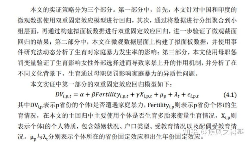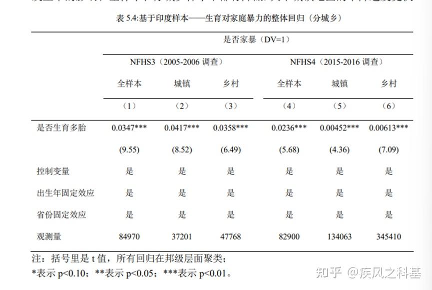 (1)生育与家暴之间的双向相关性。事实上这个问题在杨女士自己所展示的印度问卷中就提到了,家庭暴力行为中存在婚内强奸和强制生育等行为,这意味着家庭暴力存在对女性生育行为的反向影响。因此,在后续的实证过程中,应当排除这种要素对模型结果造成的影响,采用合适的工具变量对这一问题进行处理。但杨女士的文章中显然没有内生性检验和工具变量分析的过程。